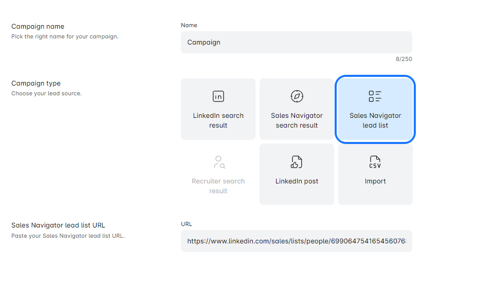- Once you’ve filled your list with leads, it’s time to set up your campaign! Copy the URL of your Leads List, paste it into the designated area in the Lead Bridge, and give your campaign an awesome name.