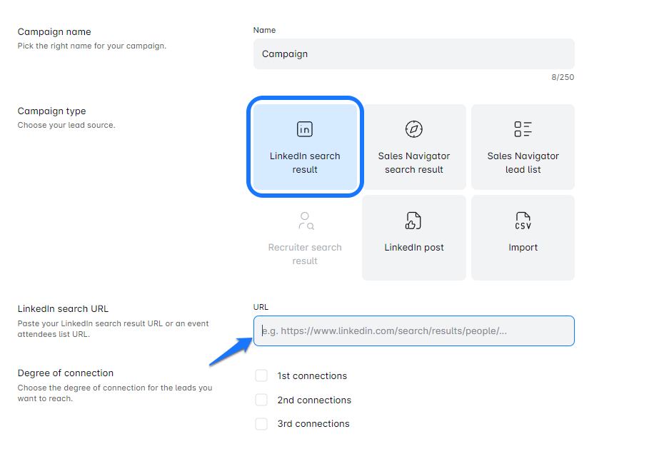 In Lead Bridge, paste your LinkedIn search URL into the designated area. Give your campaign a name that resonates with your goals.