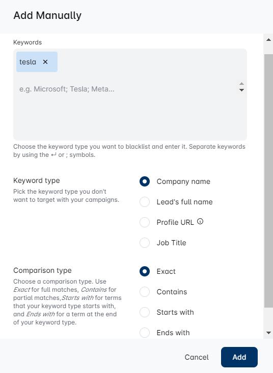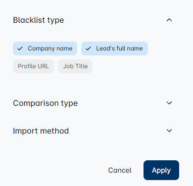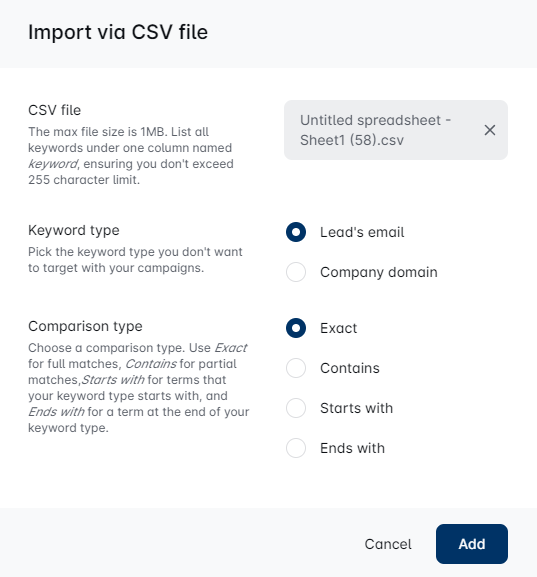 - Exact - Add a term that fully matches the selected blacklist type to avoid it. This means that the value from the CSV file will be added to the blacklist exactly as it is written. For example, if the company name you want to avoid has an LLC on their Linkedin, you need to add the LLC to the company name in the CSV file. This also refers to the Profile URLs you upload via CSV file. You can only select the Exact comparison type with this item.
