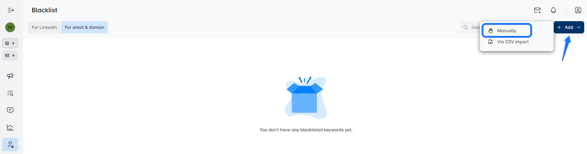 From there you can blacklist unwanted leads, companies, emails, and domains using the manual option or by uploading a CSV file.