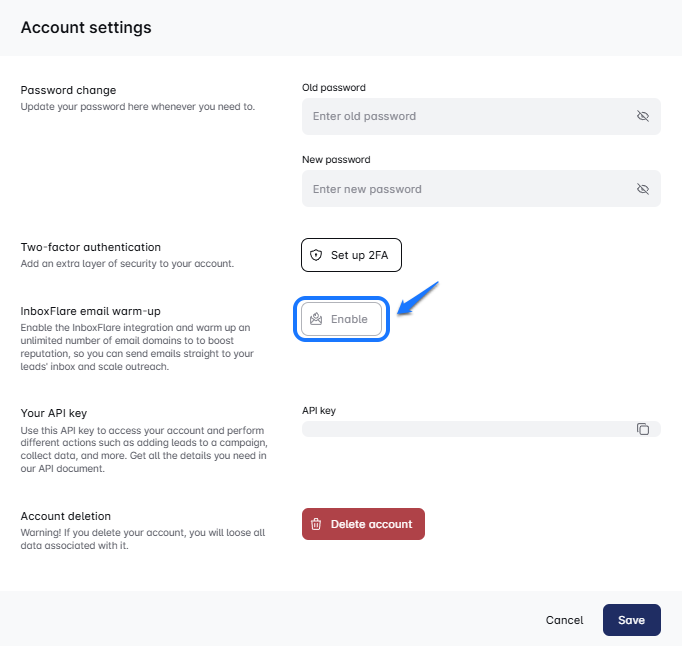 1. To start, you need to enable your InboxFlare account in Lead Bridge. Go to your Account settings in Lead Bridge and find the InboxFlare email warm-up. Click “Enable”.